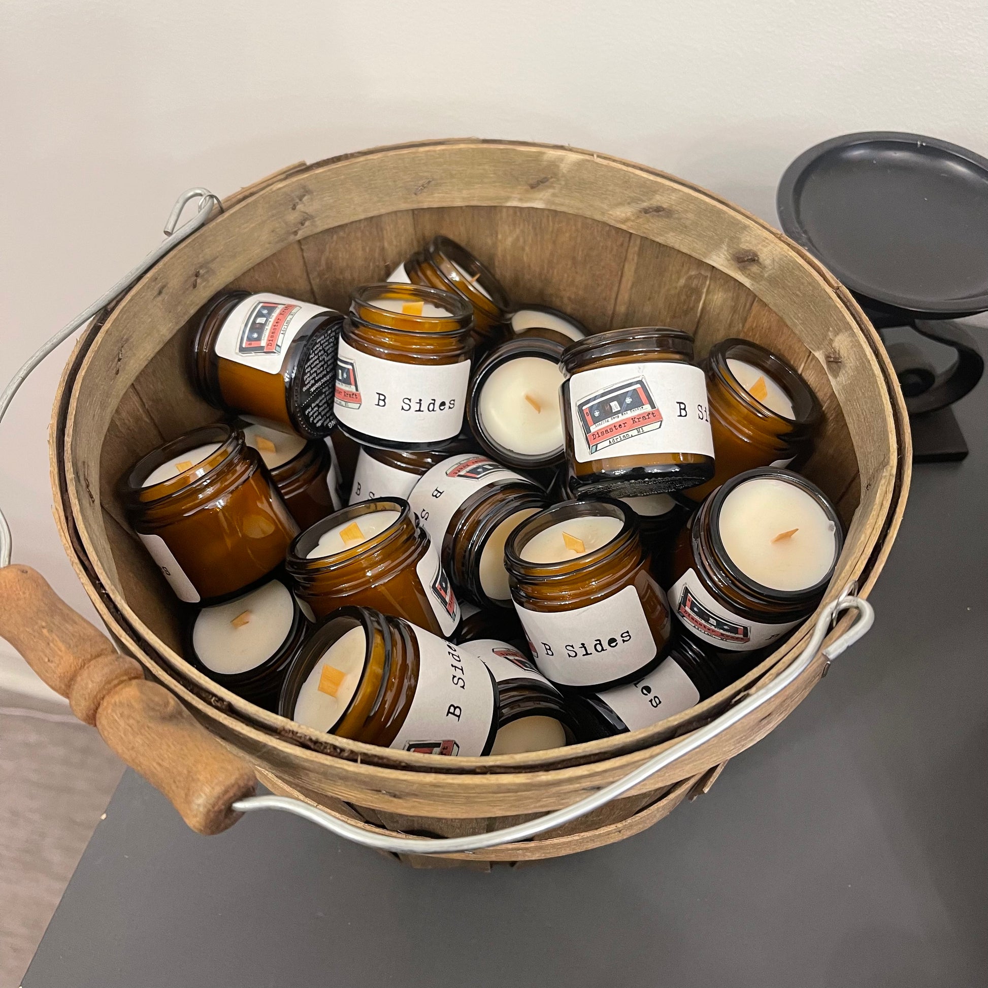 B Sides are what we call our oops...damn I forgot to label these piles. Bsides come without lids because they are at our cost to make them so the extra 59 cents for a lid seems stupid. Enjoy my mental brain deadness. These come in adorable tiny amber jars. Perfect if you are want to try one of our new scents out. These are recommended to burn for 1 hour and blow out, let cool for 5 hours before relighting. Burn times vary. These will give an idea of the scent but will not be representative of how strong a full size candle would be in your home. Due to the tiny wicks they have a tendency of not burning the same as our full size candles. Please note that we recommend these to be used on an electric wax melter and not necessarily burnt.