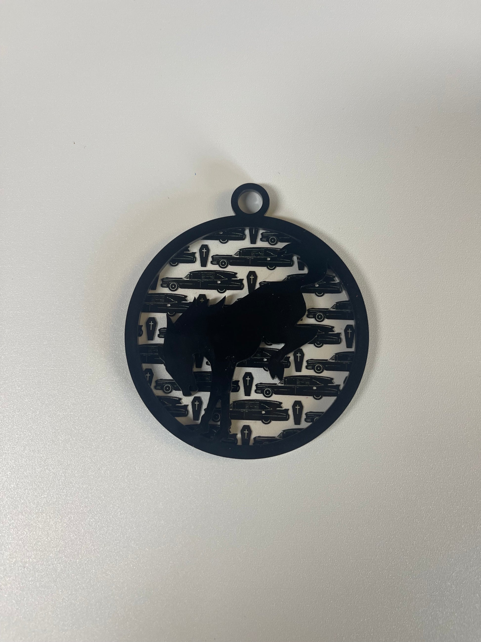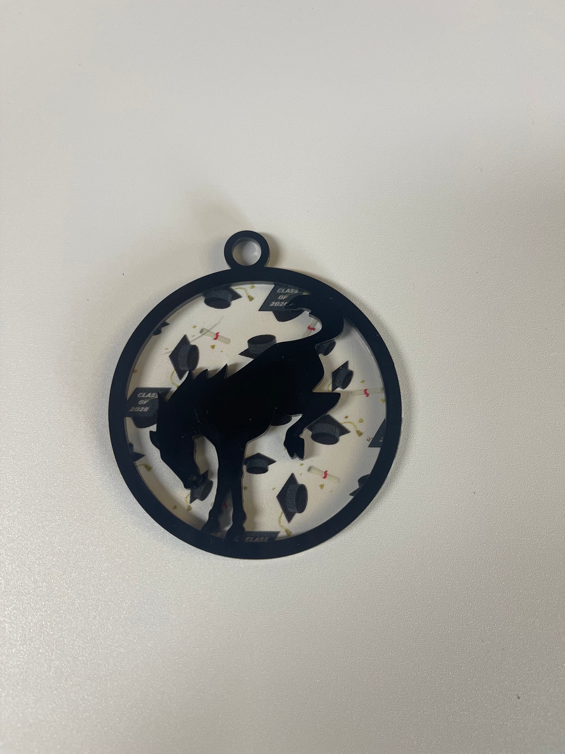 3" ornaments with your choice of backer. These are made of acrylic and background flexible material. Comes with your choice of 1 sided bronco design on it or two. Great for Christmas ornaments or for hanging from your mirror.